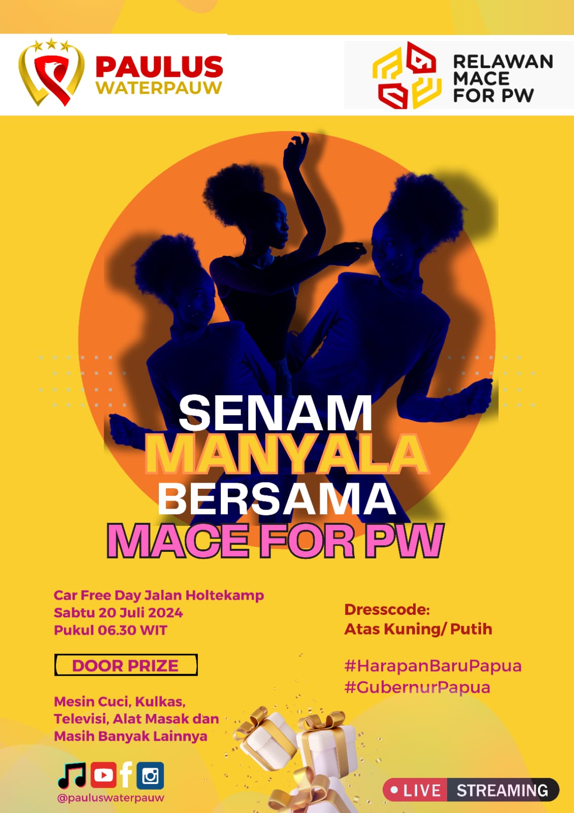 PAPUATERDEPAN, Jayapura– Relawan MACE PAPUA for PW (Paulus Waterpauw) mengajak masyarakat Kota dan Kabupaten Jayapura dan sekitarnya bergabung untuk Senam Manyala Bersama MACE for PW.