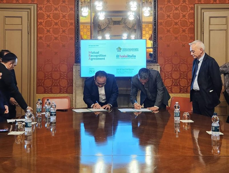 “Penandatanganan MRA ini dimaksudkan untuk membangun kemitraan yang saling menguntungkan antara Indonesia dan Italia, melalui Halal Italia sebagai salah satu Lembaga Sertifikasi Halal yang sesuai dengan standar Indonesia,” lanjut Menag Yaqut.