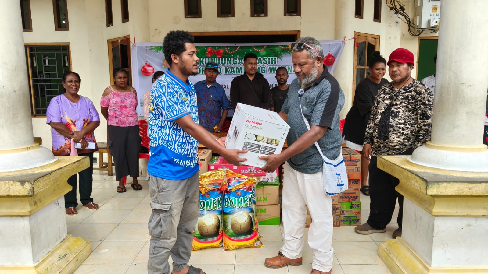 “Memasuki Natal ini adalah rasa kepedulian pemerintah, tetapi juga melalui pemerintah adat Kampung Waena memberikan sedikit sembako untuk adik-adik mahasiswa-mahasiswi yang berada di asrama ini,” ujarnya.